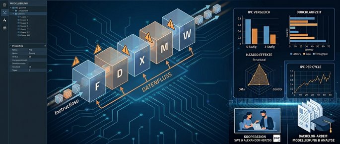 - Vergleich der theoretischen Konzepte einer klassischen fünfstufigen Pipeline (Fetch, Decode, Execute, Memory, Write-Back) mit einer dreistufigen Variante.